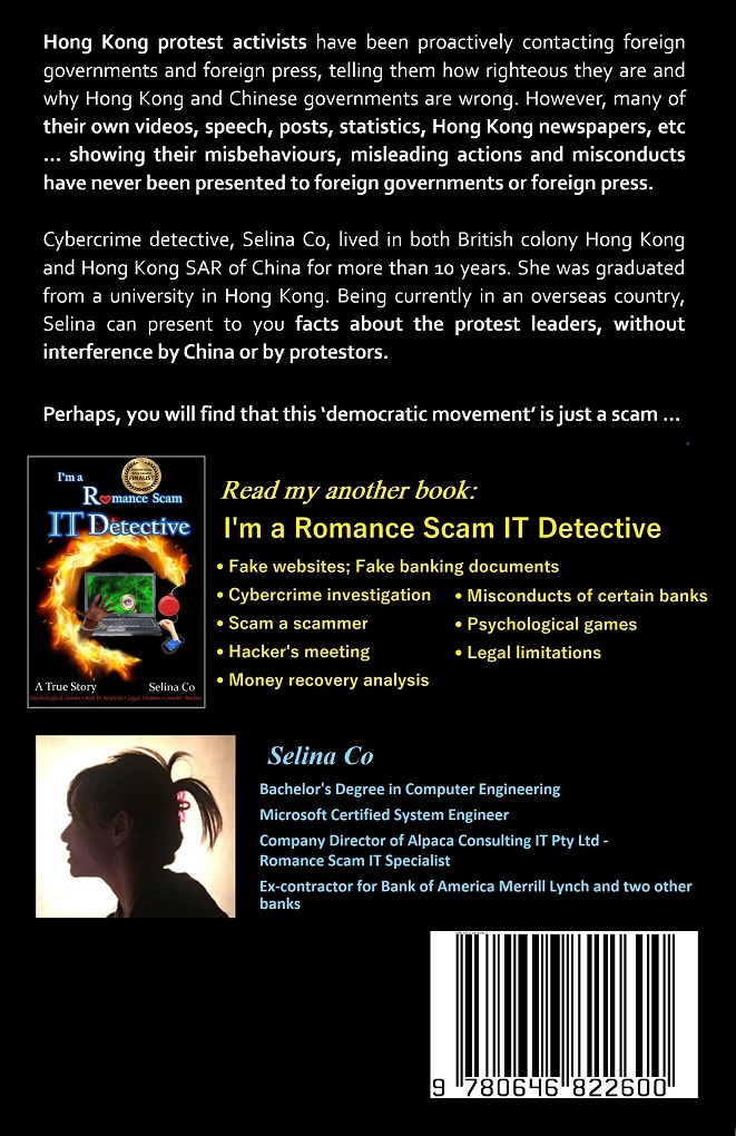 Award-winning author, Selina Co, is a Hong Kong citizen (dual citizen) and is native in Cantonese (Hong Kong’s spoken language) and fluent in English and Mandarin. Selina has interviewed Hongkongers from all walks of life and translated protest activists’ videos, statistics, local newspapers and verified reports to English, showing protest activists’ misconducts, misleading actions, lies, misbehaviours and how undemocratic protest leaders have been. Sources are presented to you whereas possible so that you can verify them. Most of these have never been presented to foreign governments or foreign press.